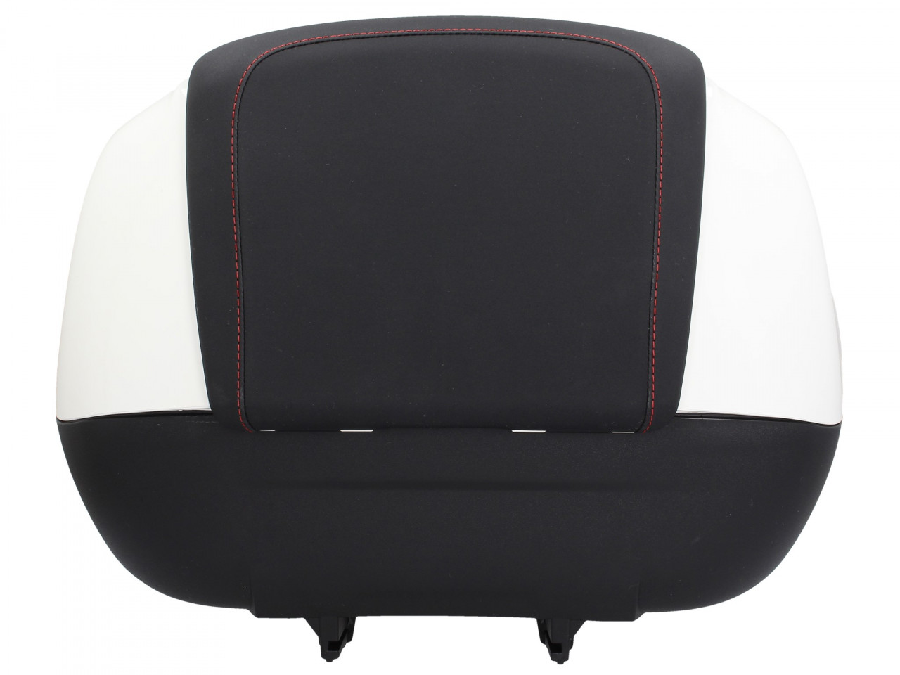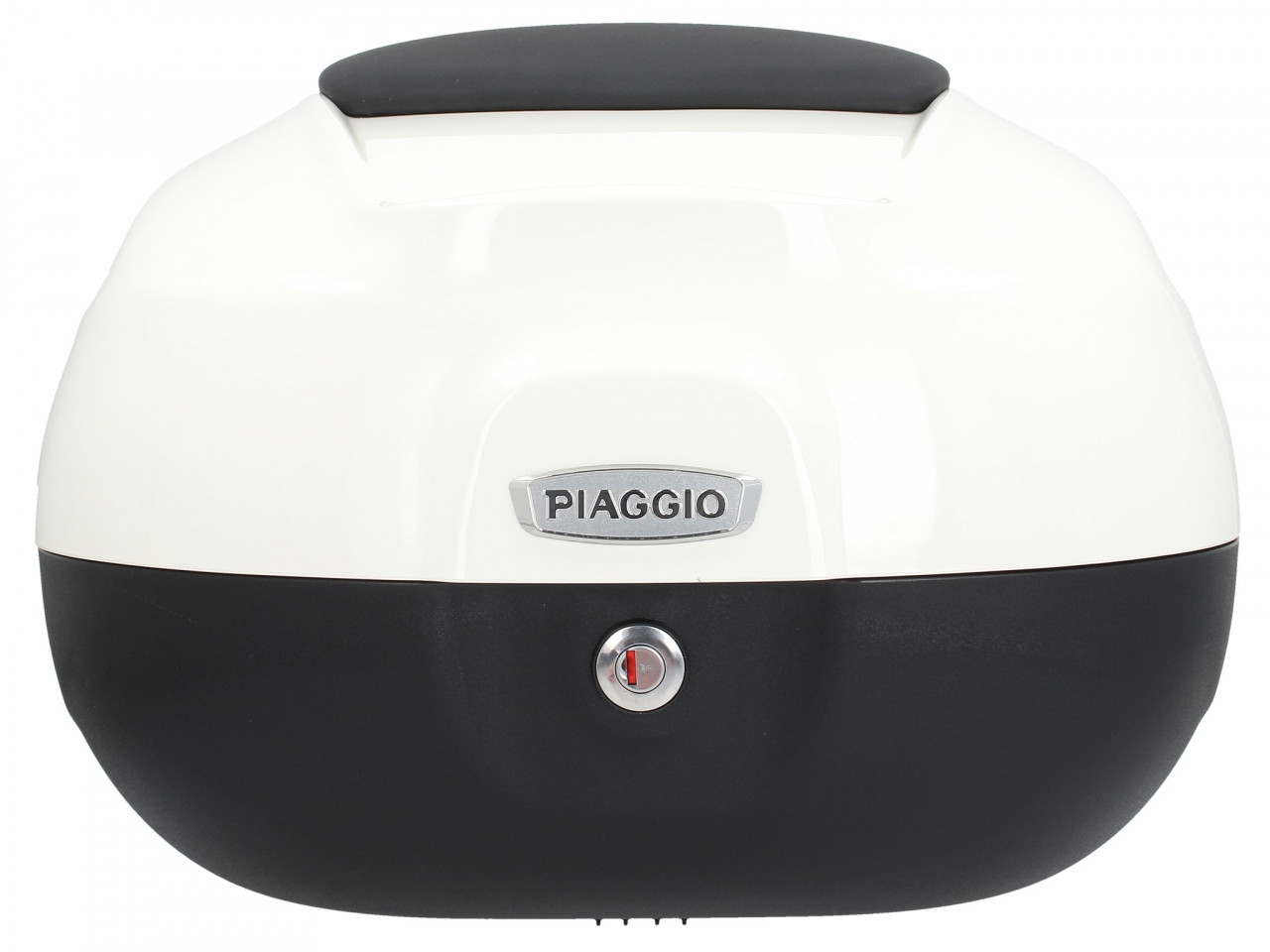 Schnellverschluss-Top-Box mit 37 Litern (für einen modularen Helm oder zwei Demi-Jet-Helme). Das Cover hat die gleiche Farbe wie das Fahrzeug und das Piaggio-Logo. Beinhaltet eine Komfort-Rückenlehne für den Beifahrer aus demselben Material und derselben Farbe wie der Sattel. Das Installationskit 1B003247 wird für die Montage auf einem standard Gepäckträgerbenötigt.