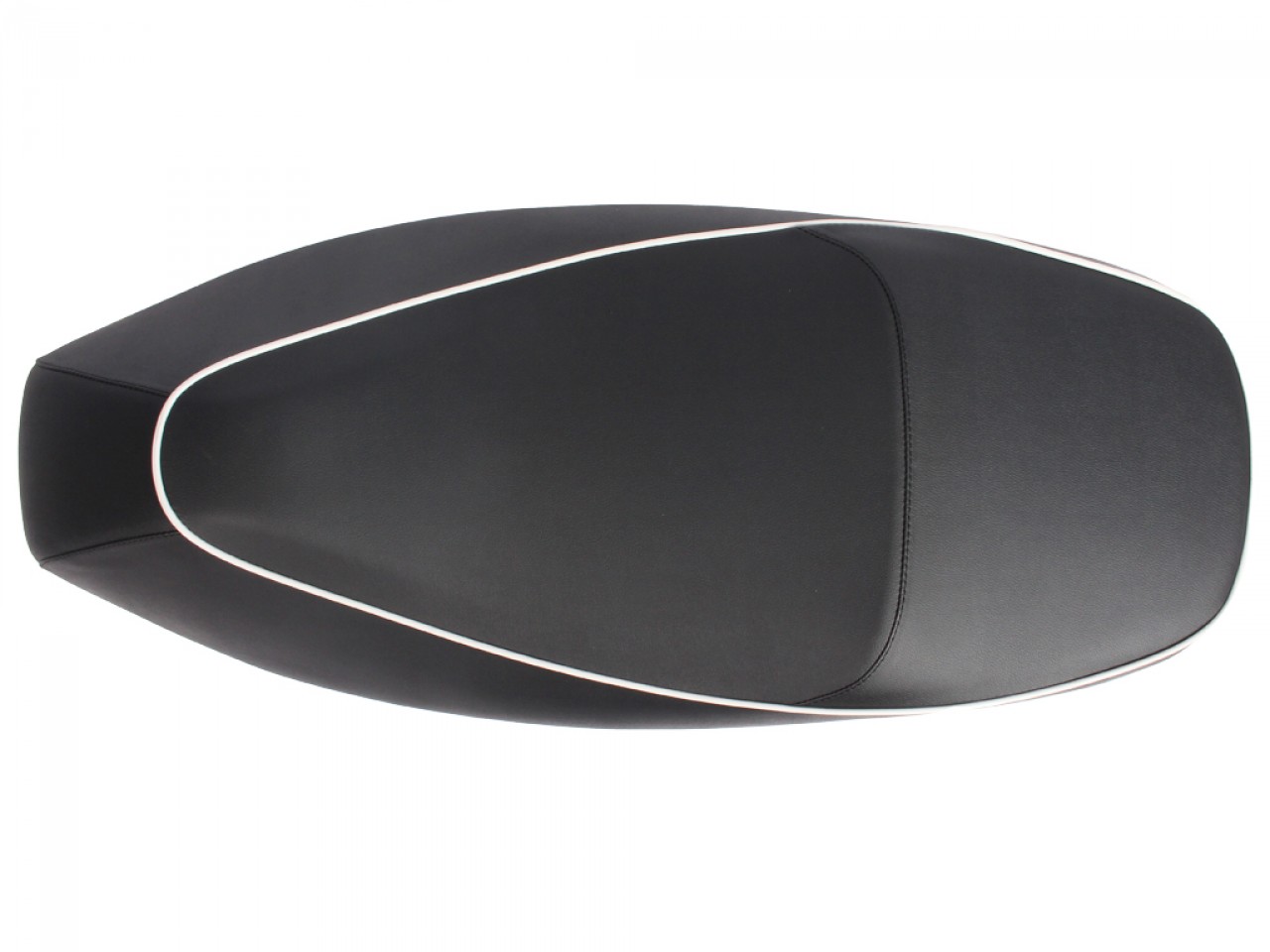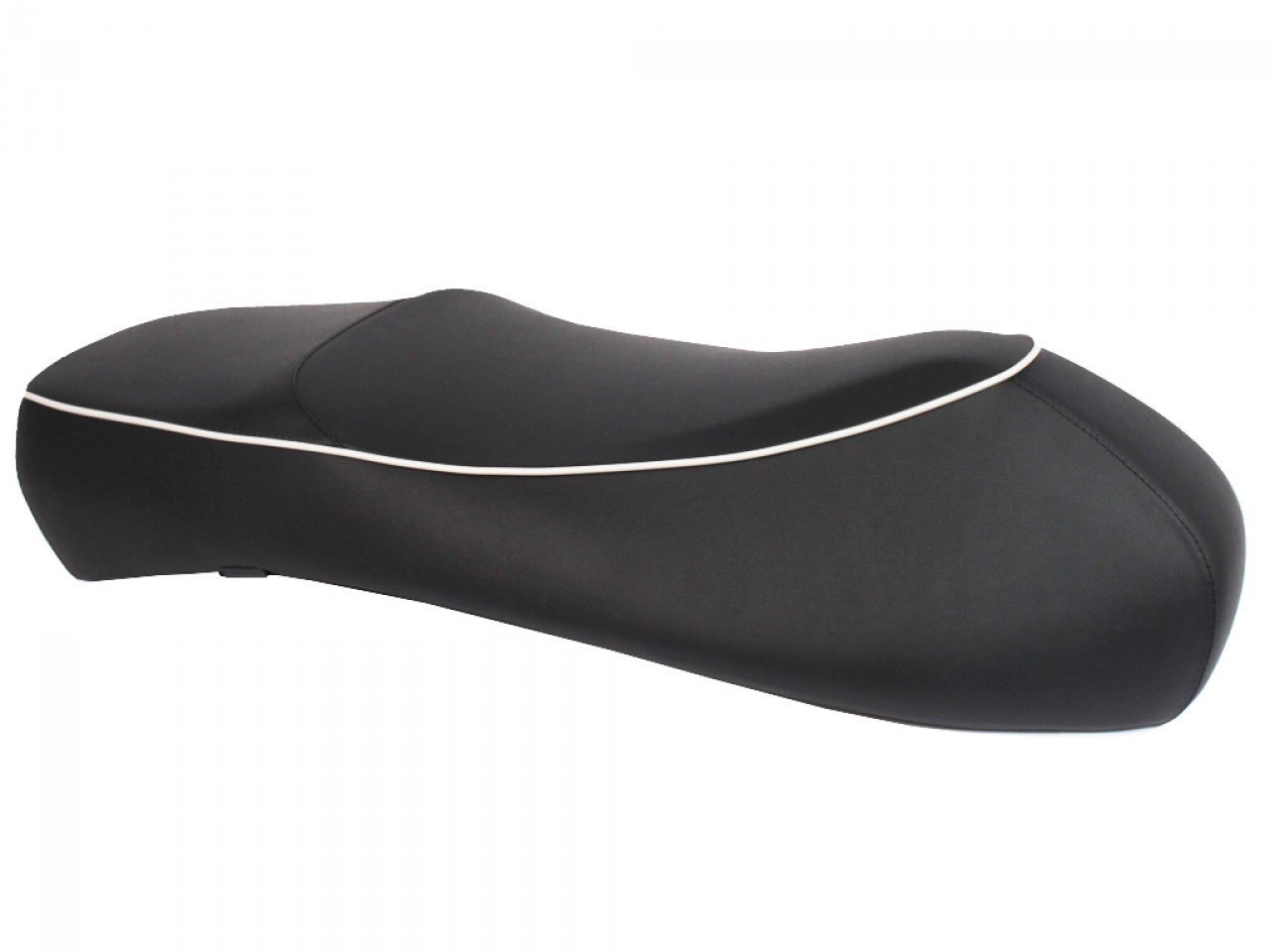 Doppelsitzbank für Vespa GTS aus schwarzem Kunstleder mit weisser Keder.