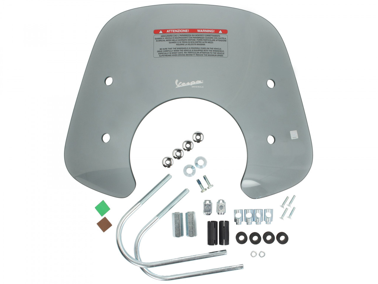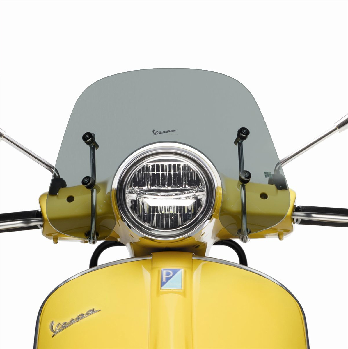 Das Vespa Logo und die verchromten Halterungen runden den effektiven Windschutz des getönten Vespa Flyscreens ab.
